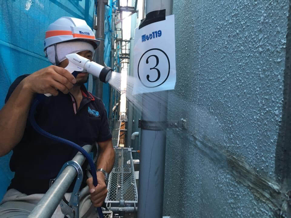 雨ん防では、修繕前に散水調査という工程を行っています!これは、実際にホースで水をかけて、雨漏りが再現されるかどうかを確認する調査。